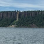 By noon, I was soaked in sweat and exhausted. I needed a break and began looking for someplace to pull over. With the George Washington Bridge still in the distance, I spotted a gang of kayakers up ahead. I started to paddle harder to catch up to them when they made a beeline across the river. I backed off and let them go. They had paddled across the river to the Palisades, specifically to the scar. The scar is a mark that was left when an entire rock column came crashing down one night covering the area with rock. It revealed the original color of the rock untarnished by pollution. Now in the location from where they crossed over, I saw a boat club up ahead so I paddled up to it.