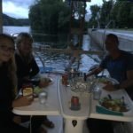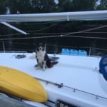 Up ahead of me was a dog on the bow of a nice sailboat and a couple of people onboard so I went up and introduced myself and asked about camping. They weren’t sure and we didn’t see any signs against so I figured this was a good place to stay for the night. The family, Daniel, Patry their daughter Zoe and dog Lola were headed back to Montreal after a year cruising the islands. They will be putting this 38’ boat up for sale. I asked to see it and they brought me aboard. I could not believe how much headroom was down below. Had to be 7’ at least. What a difference in headroom between a Costal Cruiser and the Offshore boats I had been looking at prior to this trip.