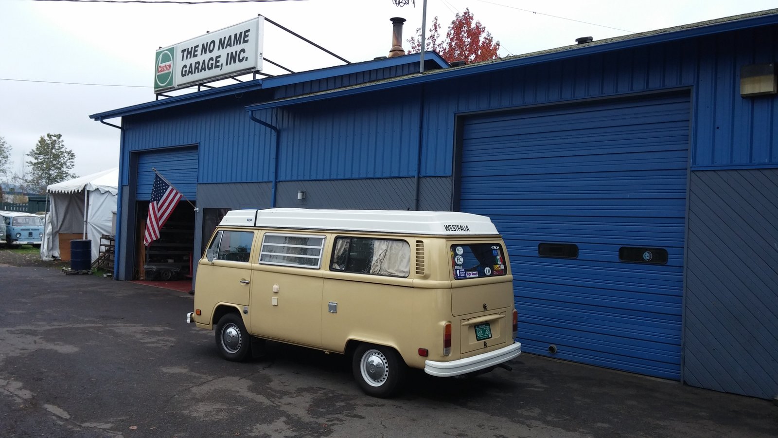 We pulled into Eugene last night around 5:30pm. Our first stop was at The No Name Garage to see Miles. Miles has been around VW’s all his life as his Dad was a VW Mechanic. Miles and his mechanics not only know VW’s inside and out, they know Buses. Most of them own one, drive them daily and their shop and lot is full of buses. I figured this would be a good place to tend to some minor issues we were having and have Sandy looked over since we put 1000 miles on her. Miles offered us a place to camp for the night and he’d be taking the bus in first thing in the morning.