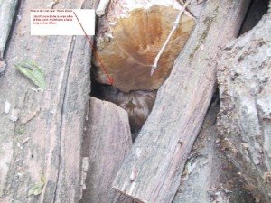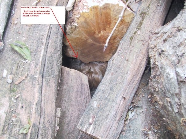Lexie Lost and Stuck 4 At this point she is still stuck and the two large logs on top of her need to be braced to prevent them from moving before I try to get to her, but I know she is alive for now. If either of those logs move, she will be crushed.